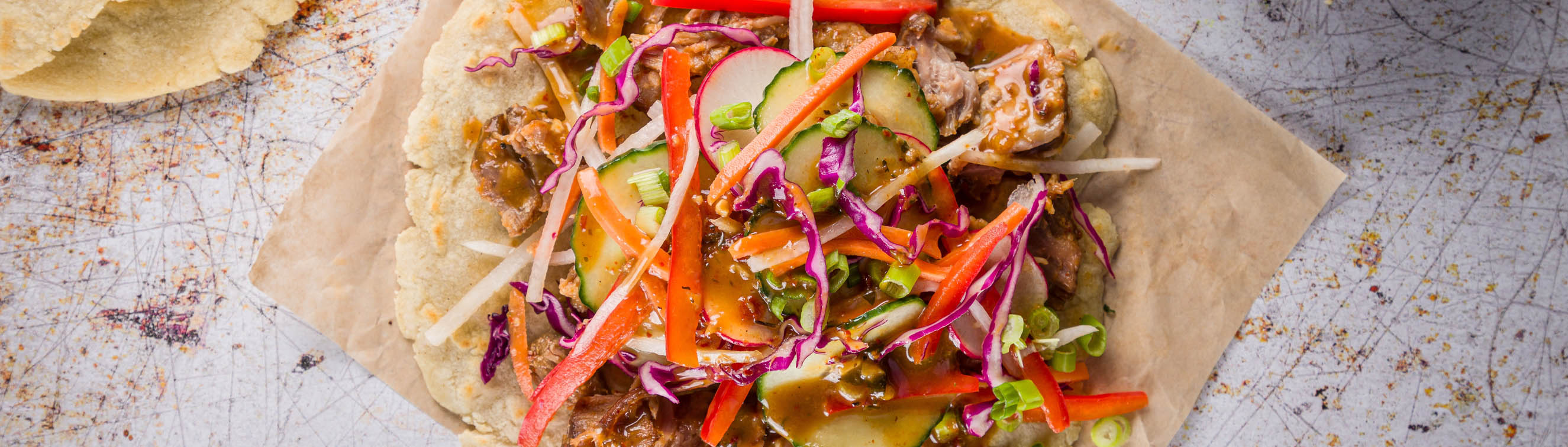 A handmade masa tortilla topped with curried pork carnitas and fresh market vegetables, and red curry coconut sauce
